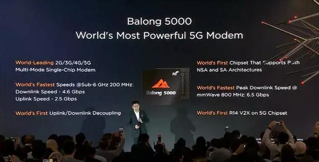 华为的Balong 5000,是一款单芯片多模的5G模组,能够在单芯片内实现2G、3G、4G和5G多种网络制式,有效降低多模间数据交换产生的时延和功耗。并且在全球范围内率先支持NSA和SA联合组网方式,支持FDD和TDD实现全频段使用。同时,实现业界标杆的5G峰值下载速率,在Sub-6GHz(低频频段,5G的主用频段)频段实现4.6Gbps,在毫米波频段达6.5Gbps,是4G LTE可体验速率的10倍。