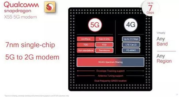 在5G时代,高通也是处于领先地位,高通X55基带处理器是迄今最先进的5G方案之一,多模支持2G到5G制式,覆盖全球全部地区的全部主要频段,并实现7Gbps的最高5G速率。骁龙X55基带采用了最先进的7nm工艺制造,单芯片即可完全支持2G、3G、4G、5G,其中5G部分完整支持毫米波和6GHz以下频段、TDD时分双工和FDD频分双工模式,以及SA独立组网和NSA非独立组网模式。