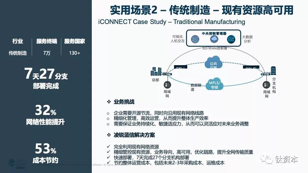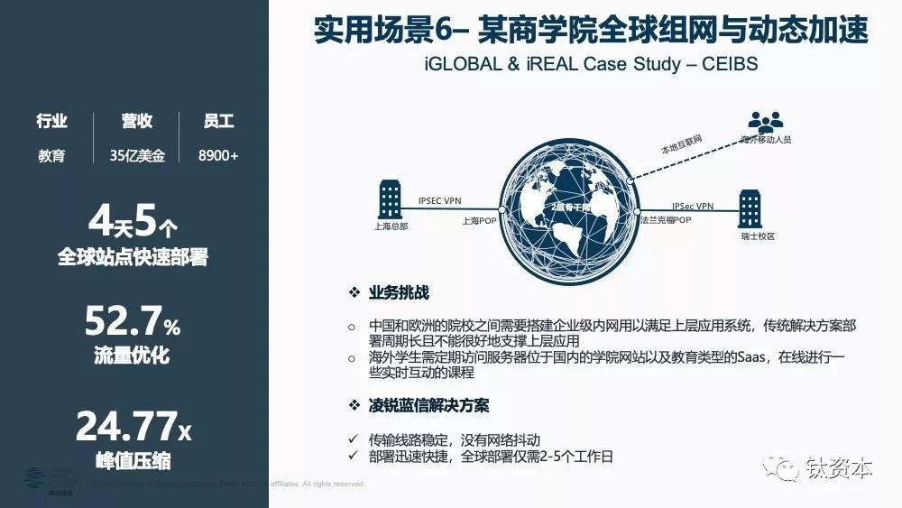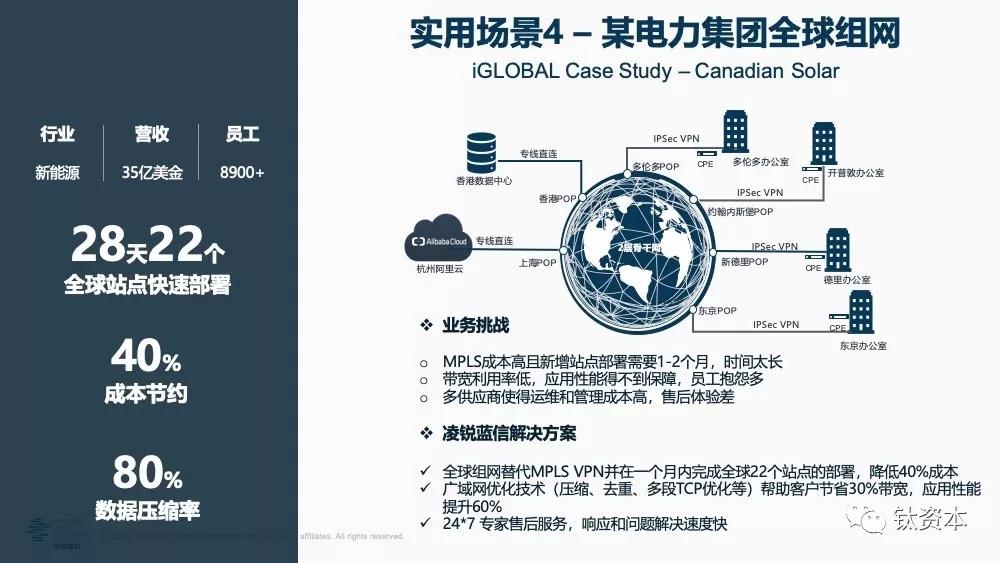 第四个场景是国际化组网。中国现在有“一带一路”,很多的国内企业都要冲到海外,在欧洲、北美、日本、南非等各种地方都需要全球组网,SD-WAN可以非常快速的实现这一点。国际上拉一条线,快则四五个月慢则半年,比如一家企业在国内外有22个分支机构,如果要拉22条线,基本上要一年以后了,但一年后商机是否还在则是个大问题;SD-WAN可以帮企业在一个月内全部搞掂,快速抢占市场并确保安全性和可靠性,因为SD-WAN就是即插即用。