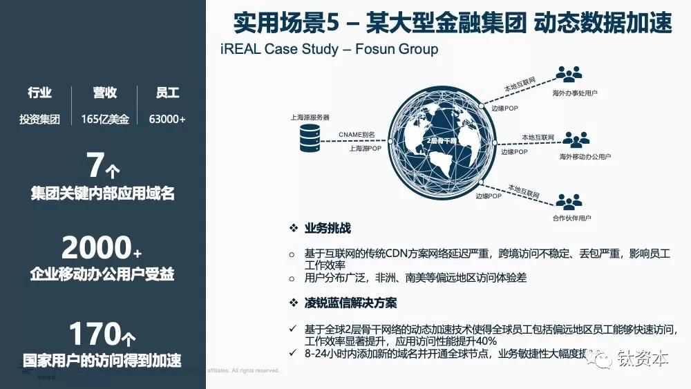 第五个场景,云节点组网和动态加速同时进行。现在很多企业要用海外云,主要是AWS、Office 365,用传统的方案拉条线做云节点组网会很麻烦,因为微软基本不允许其它专线进入微软的数据中心,这时组网就得走流程,但SD-WAN可以解决这一问题。