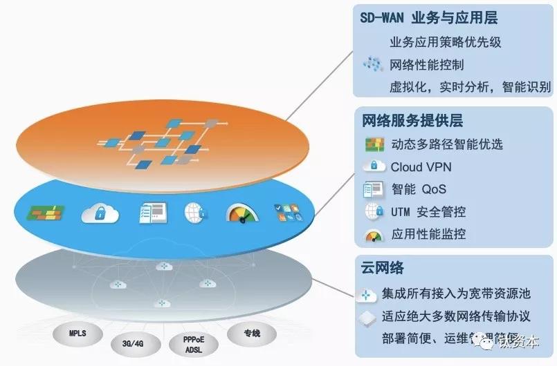 SD-WAN怎么来解决呢?SD-WAN分为三层:第一层是业务和应用层,SD-WAN可以面对业务层、应用层进行一个优先级的策略梳理、流程梳理,现在可以做到模块的定制化以及网络性能的控制、虚拟化、实时分析、智能识别等;第二层是网络服务提供层,当第一层梳理好后再调动网络的功能层,比如动态智能路由、QOS、安全管控、性能监控、VPN等;第三层是云网络,也就是SD-WAN的终端,可以接入MPLS、3G、4G、PPPOE、ADSL、NEPL专线、SDH,之后依靠软件的能力把不同的线路绑定在一起,形成一个虚拟的逻辑带宽资源池,也就意味着网络线路可以随时调动、实时使用,形成双活或者多活的状态。所以SD-WAN适合企业用户,可以帮企业从业务层和应用层解决网络的问题。