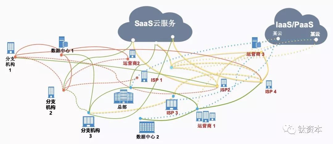 SDN出现时,恰逢数据中心大规模出现。SDN对数据中心之间大带宽的管理非常好,发展到现在的一个升级版为DCI方案。与SDN DCI有关联,但SD-WAN是完全面对企业的广域网。一个垂直行业的企业,可能不会拥有大量的数据中心,只不过租一些数据中心的机柜,还有很多的分支机构、团队或合作伙伴在外地,场景可能使用互联网或3G、4G,所以广域网的场景已经存在于其中——数据中心连分支公司、分支公司互连、分支公司上云等场景涉及SaaS、PaaS和IaaS;而分支公司连接个人、个人再上云连到数据中心等,比如涉及到在分支公司使用本地网、在外面用4G连网处理临时工作等。SD-WAN是面对企业的实际业务场景,面对广域网比较复杂的场景,都能灵活接入云端。