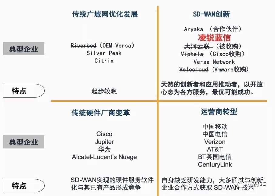 SD-WAN创新企业有Aryaka、凌锐蓝信,大河云联被收购了,Viptela被思科收购了,Versa、Velocloud被VMware收购。