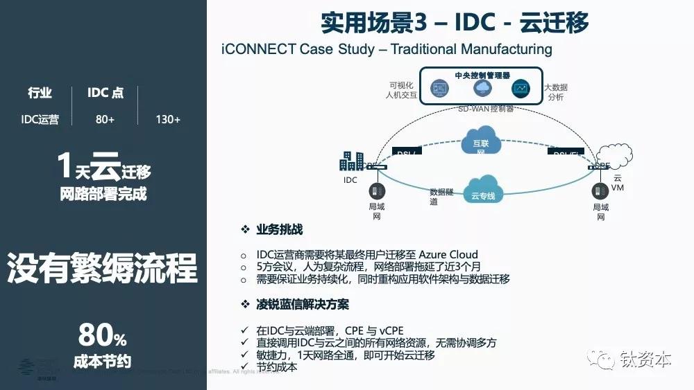 除了网络带宽外,人为的流程也是挑战。因为数据中心上云或A云到B云迁移时,中间可能涉及多家线路商及利益相关方,所以需要商讨利益的重新分配,商讨过程可能出现扯皮甚至拖黄了的情况。SD-WAN能避开复杂的流程,因为SD-WAN部署非常快、企业有控制权,可以部署在数据中心或云上的VCPE(虚拟终端),之后线路相当于变成了SD-WAN管控,可以调动SD-WAN的各种优化能力进行数据迁移,同时确保业务的连续性。