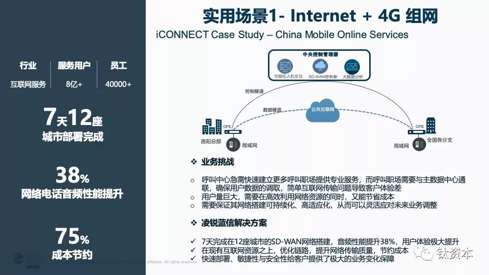 第一个场景是典型低成本的Internet+4G组网。现在大集团的很多呼叫中心,其业务挑战是:首先要尽可能快的建立呼叫组网,快速把团队建起来提供服务,建得慢就会被竞争对手抢先提供服务;其次呼叫组网都放在四五线的城市,因为当地的人工成本低。而每个呼组网可能有几十、上百人的规模,如果为了呼叫组网与主数据中心通讯而建个数据中心或租数据中心专线,不仅没有业务敏捷力而且成本也是问题。因此,使用SD-WAN加载Internet的部署模式就非常快速,因为SD-WAN本身包含了优化的软件模块,加载普通的Internet之后可提升Internet的性能、保证输出。SD-WAN是一个即插即用的产品,不用再做部署或慢慢调参数,几个小时就可以部署好,第二天就可以用。
