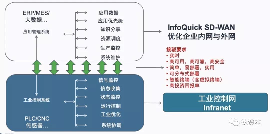其次是工业4.0。一个制造企业特别是大型制造企业,工业网分企业网和工业控制网两部分,上层企业网运行ERP、MES、大数据以及其它的应用管理和数据等,与底层的工业控制网对接,底层的工业控制网就是设备的信号监控、收集、运行、协调等等,包括对传感器的控制。如果SD-WAN能够在企业网里做好梳理的工作,然后对接给工业控制网,运行起来的效率就会非常高,所以存在一个很强接驳的要求是实时性,而且是高可用、高可靠、高安全性,最好是简单易部署。