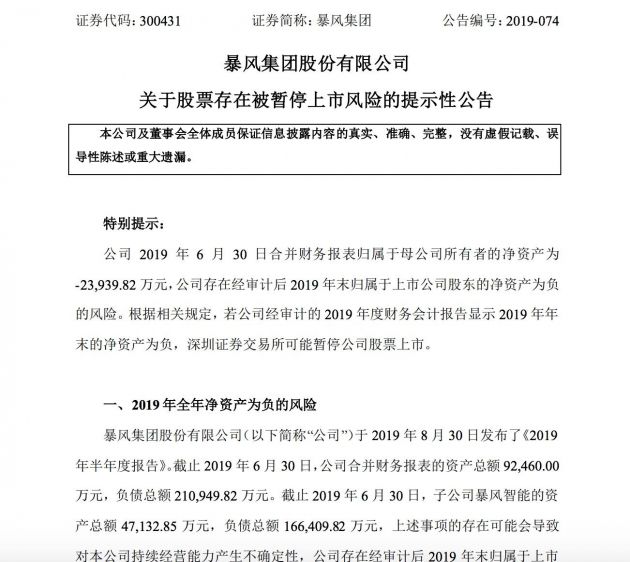据锌财经获悉,9月28日,暴风集团发布公告称,公司2019年6月30日合并财务报表归属于母公司所有者的净资产为-23,939.82万元,公司存在经审计后2019年末归属于上市公司股东的净资产为负的风险。