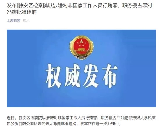 就在本月4号晚间,暴风集团发布公告称,公司收到证监会《调查通知书》。因涉嫌信息披露违法违规,证监会决定对暴风集团进行立案调查。而早在今年7月,“上海检察”微信公众号发布消息称,静安区检察院以涉嫌对非国家工作人员行贿罪、职务侵占罪对犯罪嫌疑人暴风集团股份有限公司法定代表人冯鑫批准逮捕。