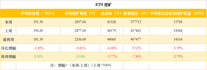 etherchain.org 数据显示,目前平均挖矿难度 2457 T,环比下降 0.8%;平均算力上下降 1.5%,暂报 191.3 TH/s。