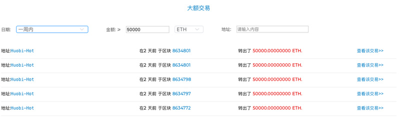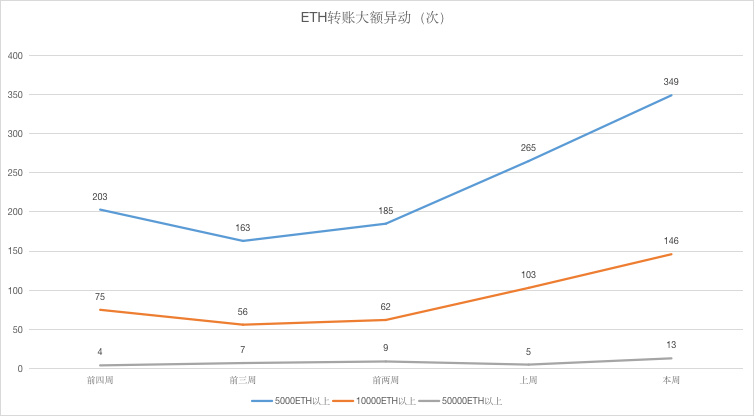 本周,“5 万 ETH 以上”转账次数共计 13 笔,最大转账金额大约 16 万个 ETH;其中 5 笔从火币钱包转出至同一地址,每笔固定金额 5 万个 ETH,该地址为富豪榜排名前 100 的地址;2 笔由 Bittrex 钱包互转;3 笔为币安钱包互转;另外 3 笔为不知名地址转账。