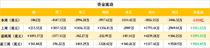 资金方面,本周资金波动较大,整周资金全部外流,单日最高超过 4500 万美元。