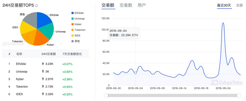 据 DAppTotal.com DEX专题页面数据显示:已统计的 17 个基于以太坊网络的 DEX 项目,过去一周链上交易额共计 279280 个 ETH(约 4747 万美元),环比下上涨 50%。