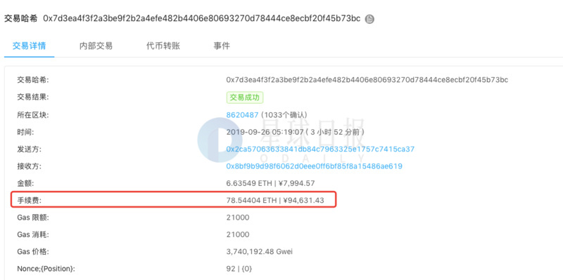 据PeckShield态势感知平台数据显示,9月26日05时19分,以太坊网络出现一笔异常转账交易,手续费高达3740192.47Gwei,价值78个ETH。