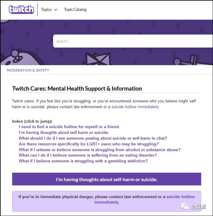 对此,Twitch在一则声明中说,“我们与国家心理疾病协会(National Alliance on Mental Illness,NAMI)等组织合作,向内容创作者提供心理健康建议,并在网站上持续提供支持与资源,并鼓励我们平台社群中的用户互相帮助。”Twitch也提供了一个自杀与危机热线列表,主播可以为有需要的观众提供转介资源。这些类似的尝试,体现的是一种公共关怀。