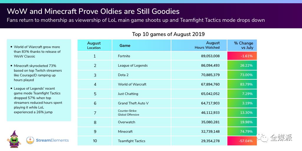今年8月底,魔兽世界怀旧服正式开服,一时间再现ID抢注排队登录的热潮,这也带动了直播流量的增长:游戏直播平台Twitch中,魔兽世界当月用户观看总时长达到6789万小时,占据当月榜单的第4位。