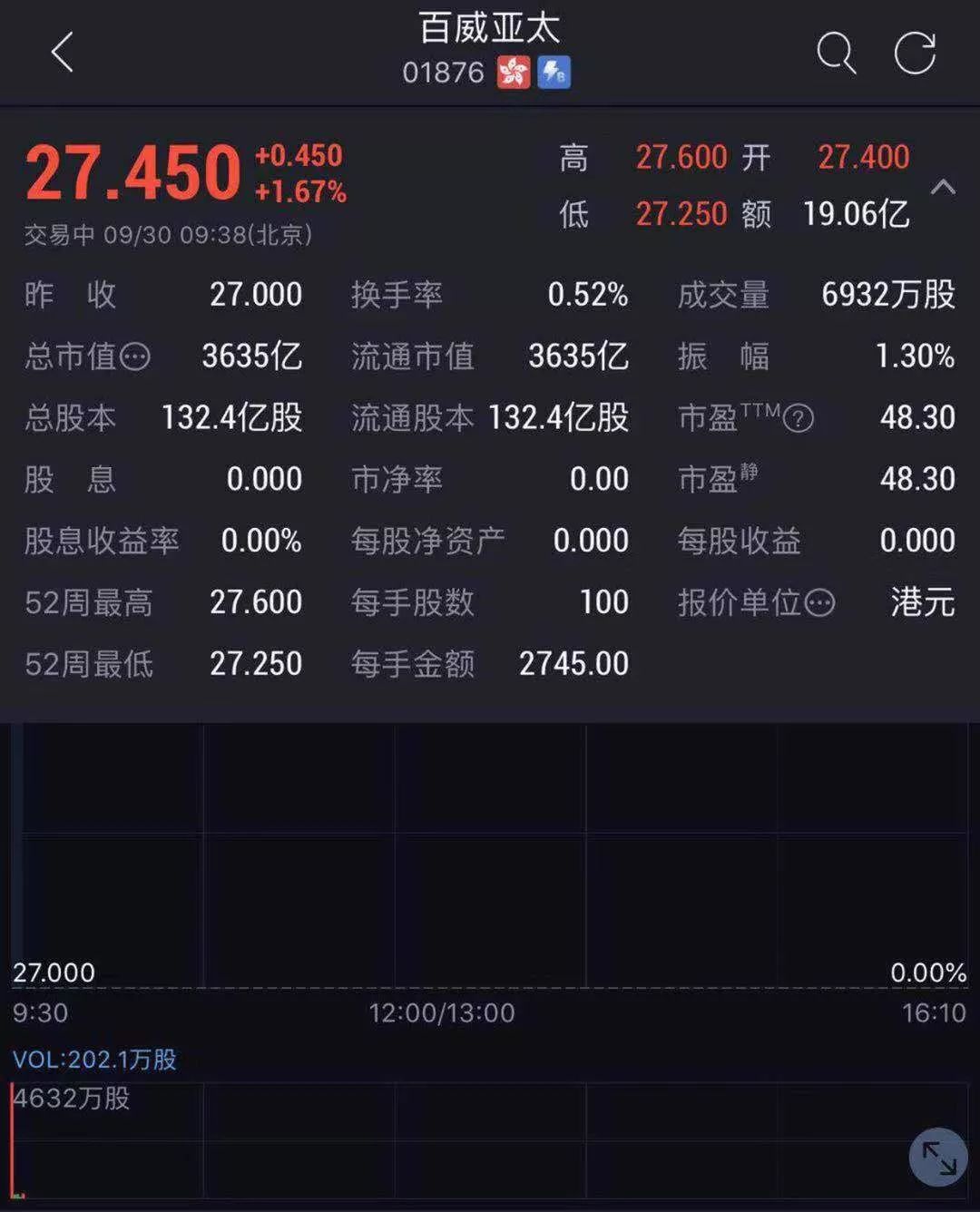 9月30日,百威英博旗下百威亚太正式在港交所挂牌上市,股票代码01876。发行价27港元,发行规模14.52亿股,首日开盘27.3港元,截至发稿前,市值超3600亿港元。