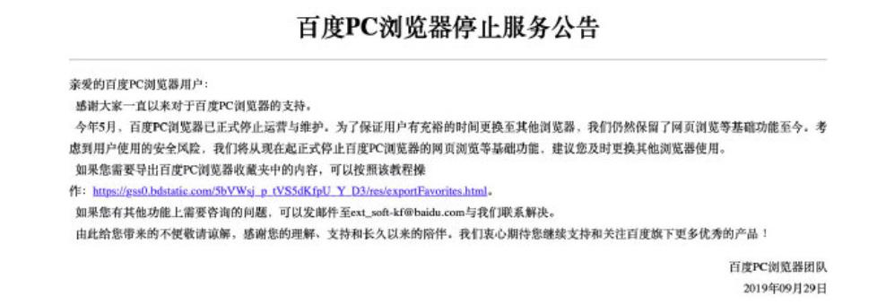 百度PC浏览器9月29日发布停止服务公告。公告称,考虑到用户使用的安全风险,我们将从现在起正式停止百度PC浏览器的网页浏览等基础功能,建议您及时更换其他浏览器使用。