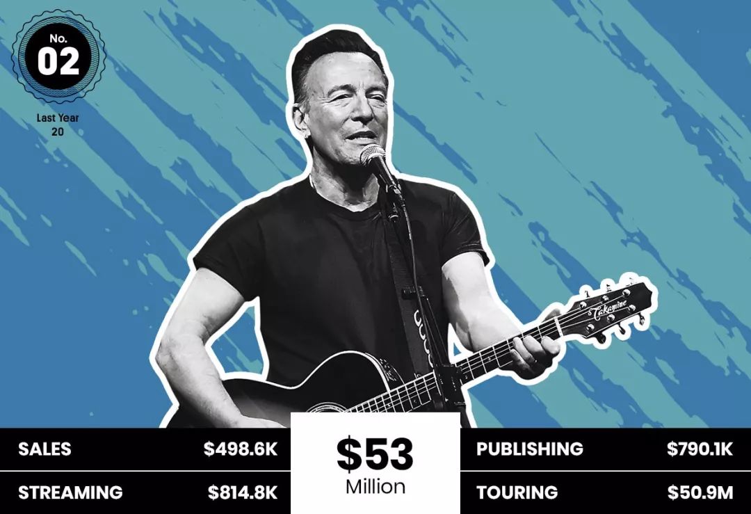 上图来自Billboard统计的2018年艺人分类收入(美国市场),“摇滚皇帝”布鲁斯·斯普林斯汀(Bruce Springsteen)尽管2018年总收入以5300万美元排名第二,但流媒体收入只有区区81.48万美元。绝大多数收入,来自巡演。