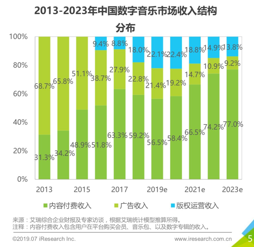 2018年,中国数字音乐市场收入构成中,广告收入(跟免费用户直接相关),占22.8%,而且,艾瑞预计,未来五年内会大幅减少,而内容付费收入占59.2%。