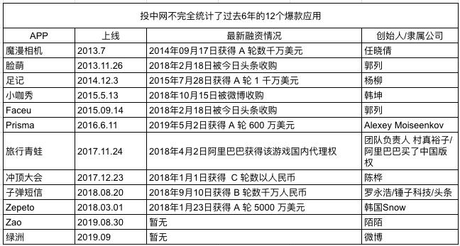投中网不完全统计了2013年至今的12款“爆款”应用,包括脸萌、足记、魔漫相机、Zao等。它们通常都是以人脸为基础,一键即可变换玩法。而它们得以传播开来,甚至刷屏,也几乎通过微信、微博等社交平台。