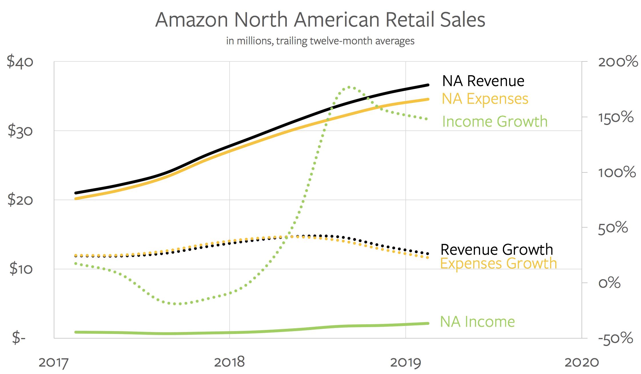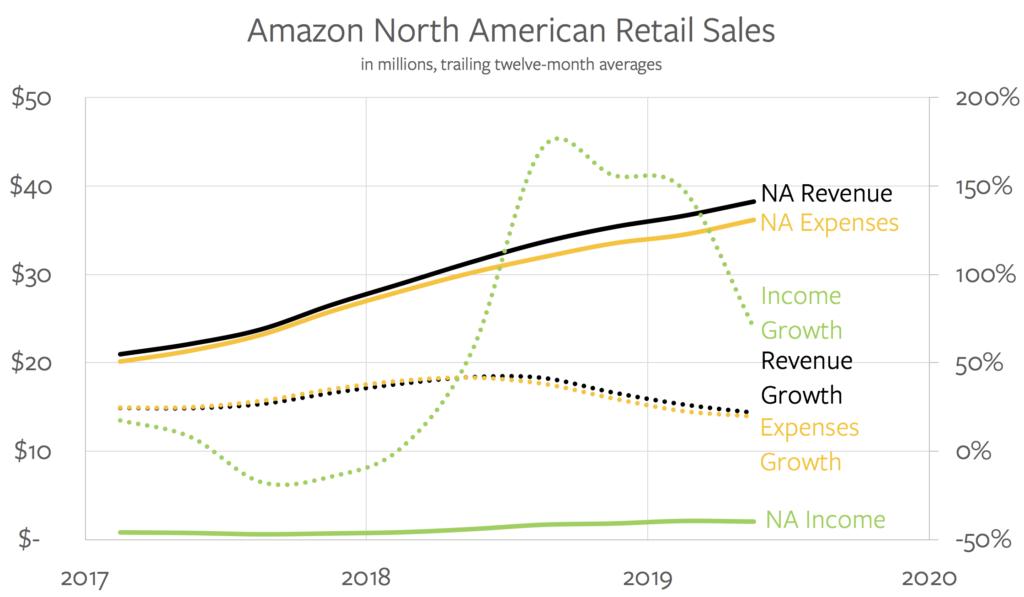 在2018年下半年和2019年上半年,亚马逊的收入和支出只出现了小幅增长,导致利润同比飙升。