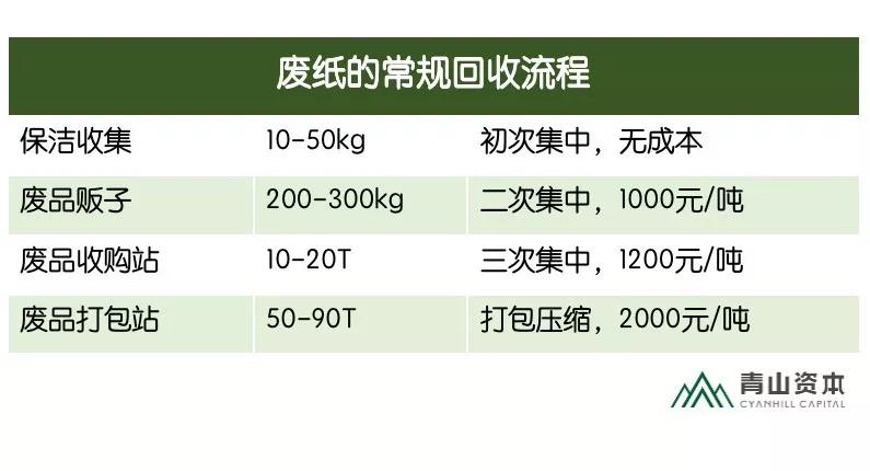 纸是最好处理、价值最高的。“好处理”看起来不起眼,其实是回收产业链里最关键的掣肘。纸的处理简单、标准,回收、清理过程方便执行,人力、物流和厂房、机器的建造成本也可规模化拉低。“价值最高”并非价格最高,而是规模、利润、产业链完整程度综合考量。