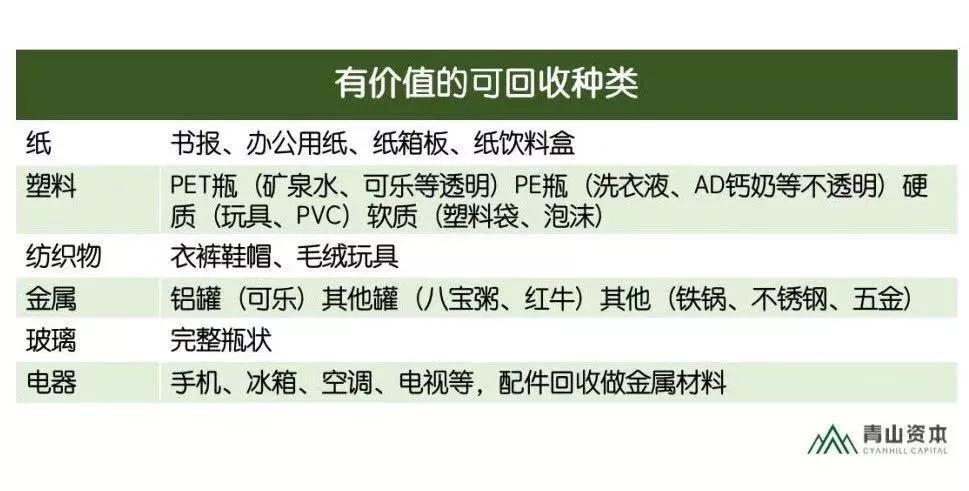 最主要有回收价值、有大规模市场的是废纸、塑料、瓶罐、衣物。