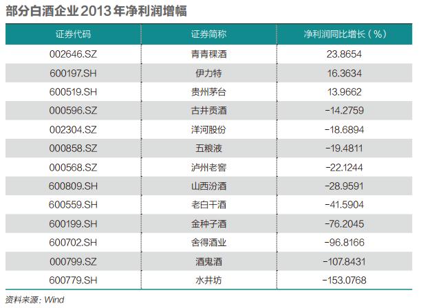 行业低迷,在当年度酒企业绩上已有反映。Wind数据显示,2013年度,在13家白酒企业中,除青青稞酒、伊力特、贵州茅台外,其余公司净利润都呈现下滑,其中4家公司下滑幅度超70%。13家酒企市值也从年初的5891亿元,一路狂跌至年末3297亿元。