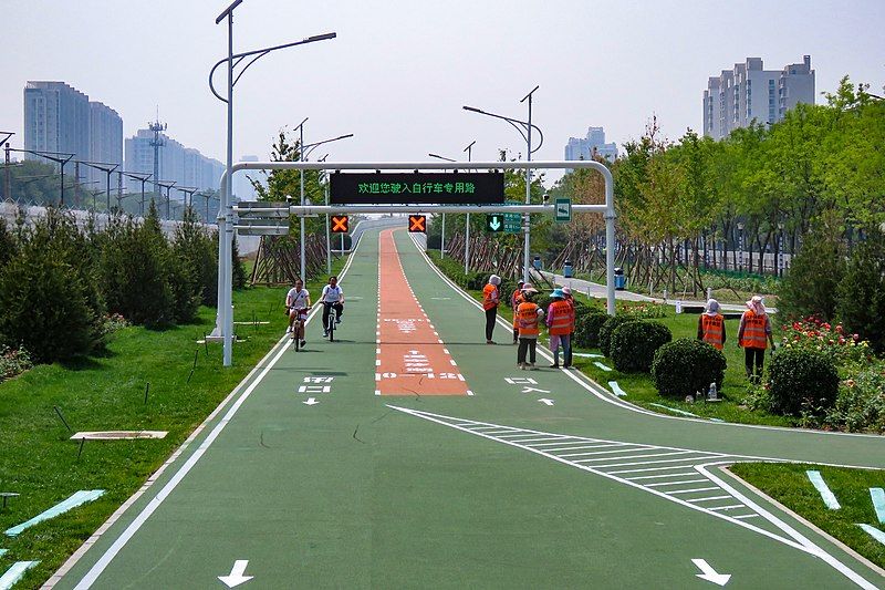 今年5月底,北京首条自行车专用道路开通,该条车道设置2条绿色通行车道,1条红色潮汐车道,禁止行人和电动自行车进入,在高峰时期可容纳3500辆自行车。