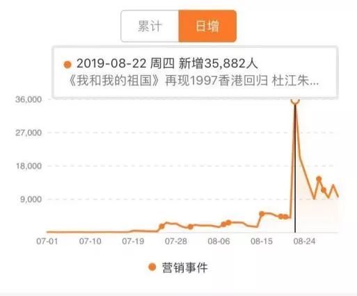 值得一提的是,《我和我的祖国》在宣传初期,热度一直不算太高,淘票票“想看”人数增速始终较慢。“想看”人数第一次猛增出现在8月22日(增长了3.58万),这天片方发布了《回归》的预告片,而彼时正值香港骚乱的发酵期——平台数据显示,“想看”用户中有半数左右是24岁以下的年轻人。