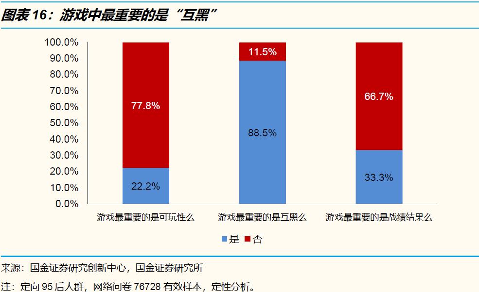 而在《第五人格》这类不平衡性较为明显的游戏,因其是一个监管者对战多个求生者(1v4),求生者需要配合逃脱,“开黑”对于靠谱的队友的选择很重要。根据我们针对95后的调研数据,被访者 中有88.5%的人认为游戏最重要的是“互黑”,而仅有22.2%和33.3%的人认为“可玩性”和“战绩结果”是最重要的。