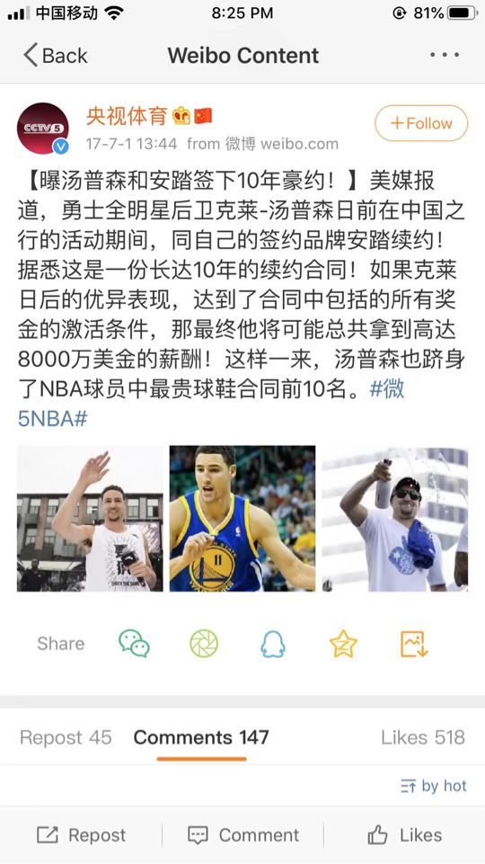 此次事件中遭受重创的不仅有NBA,还有身处其中的明星球员们。尽管哈登、威少带头道歉,但NBA在国内遭遇封杀势必殃及队员。曾几何时,NBA明星球员是各大品牌竞相追逐的合作伙伴,手机、运动、餐饮、汽车不一而足。vivo曾找过库里代言、联想与科比“联姻”,安踏用8000万美元的价格签下汤普森10年光阴。李宁、匹克也都曾用天价与NBA球星签约。这两年篮球题材综艺的兴起又为这些球星提供了曝光渠道。