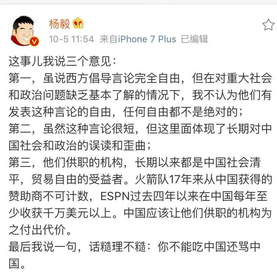在10月6日虎扑宣布将火箭队专区锁定的公告底下,有网友表达不舍:“火箭区锁了有点难过,没有家了。”随即被人回复“有国才有家”、“中国就是你的家”。在这场风波中,球迷想看NBA而不得的小情绪或许是最微不足道的损失了,轻易就会被湮没在激昂的爱国情绪中。