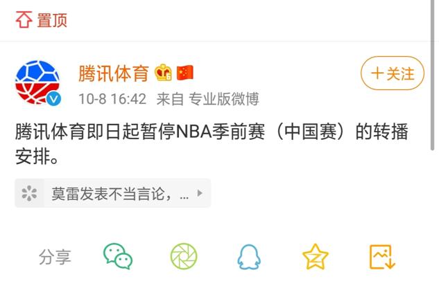 过了不到两个小时,腾讯体育也宣布即日起暂停NBA季前赛(中国赛)的转播安排。但与免费播放NBA比赛的央视不同,对腾讯体育而言,停播不是简单的一次表态,更意味着实实在在的经济损失,15亿美元或许就此打水漂。