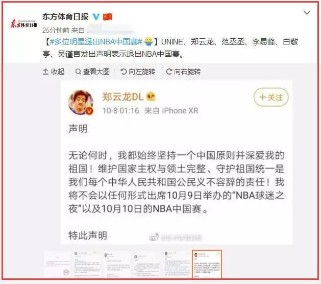 如果说莫雷事件殃及的只是火箭队,那么NBA主席肖华的声明则彻底断了NBA的中国市场:停止转播、赞助商迅速撤退……“毫无疑问,经济方面的损失已经存在”,肖华的声明提到“莫雷的推特已经造成相当严重的后果”。