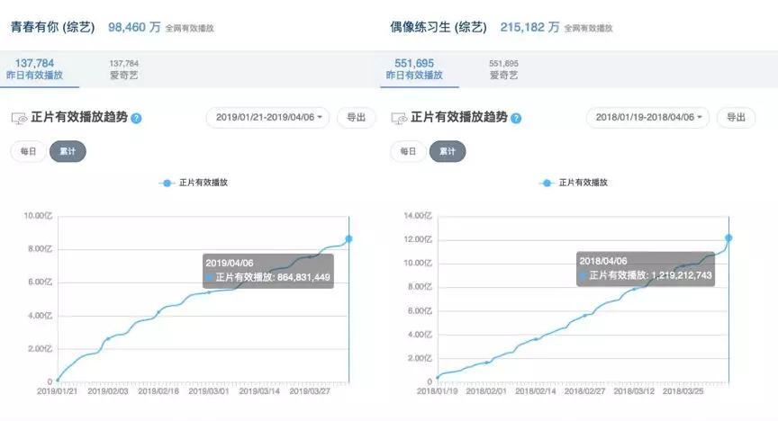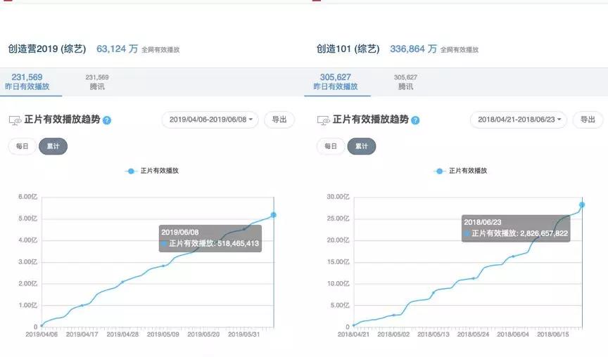 根据云合数据显示,《青春有你》播出期间的有效播放量为8.6亿,比起《偶像练习生》的12亿有一定差距;同样的情况还出现在《创造101》与《创造营2019》上,《创造营2019》有效播放量接近5.2亿,与《创造101》过28亿相比,呈现断崖式减少。