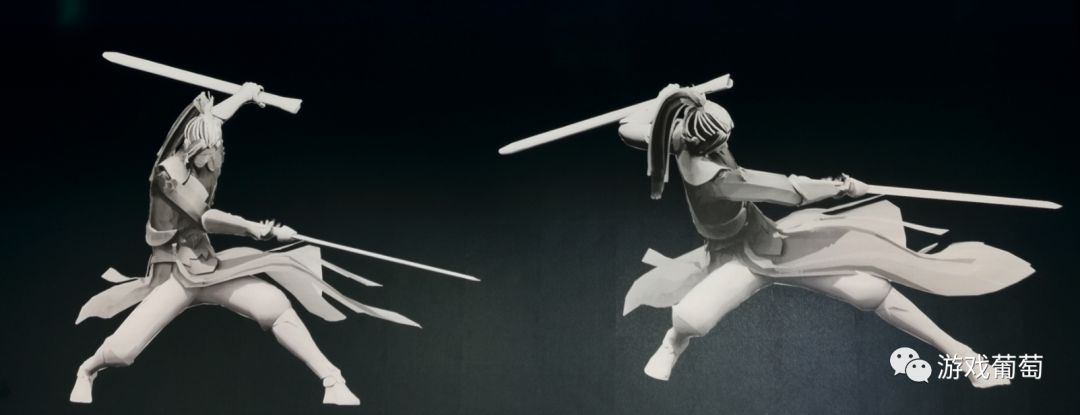 我们做Pose时强调的是构图上的平衡,而不是绝对意义上的平衡。大家看右边的Pose,前倾力度非常大,伸出去的手臂和剑很长,但其实面积不大。这时我们会通过身体右侧的布料和剑来平衡这种效果,虽然重心在左边,但右边有更多元素,整个画面的感觉就是平衡的。