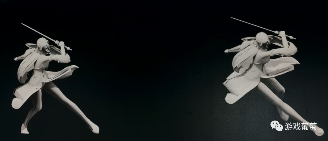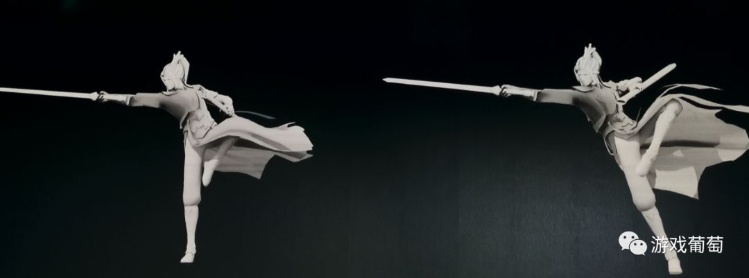 这些Pose的调整非常基础,但在游戏中,右边的Pose可以传递出比左边那种传统Pose更多的动态信息。而且在快速的战斗中,一个好的Pose可以给玩家带来脑补的效果。左边一个预备,右边一个攻击,玩家看到这两个Pose,自然会脑补攻击从左边打到右边的样子。