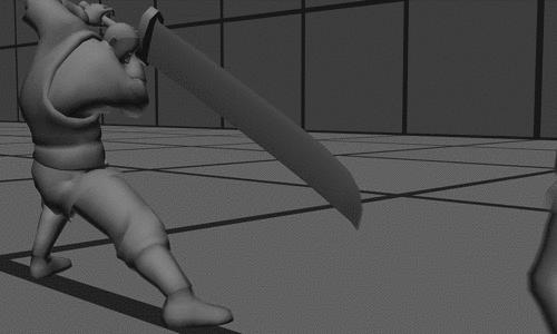 很多游戏做连续的两次打击会做快速的左右挥剑,但我们会根据节奏选择反手拿剑从右上到左下斜挥下来再反手前刺,挥下来的缓冲正好是前刺的预备。以此来匹配快速两次打击的节奏。