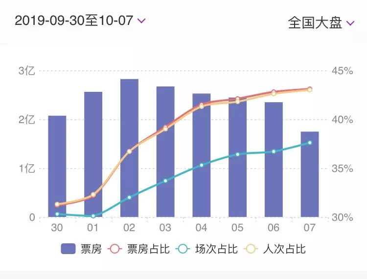 艺恩数据显示,2019年国庆档仅用三天时间,就打破了2018年七天的票房纪录,并以43.82亿(10.1-10.7)的总成绩,打破了2017年26.4亿的国庆档票房纪录,成为中国电影产业化改革以来,票房最高的国庆档。