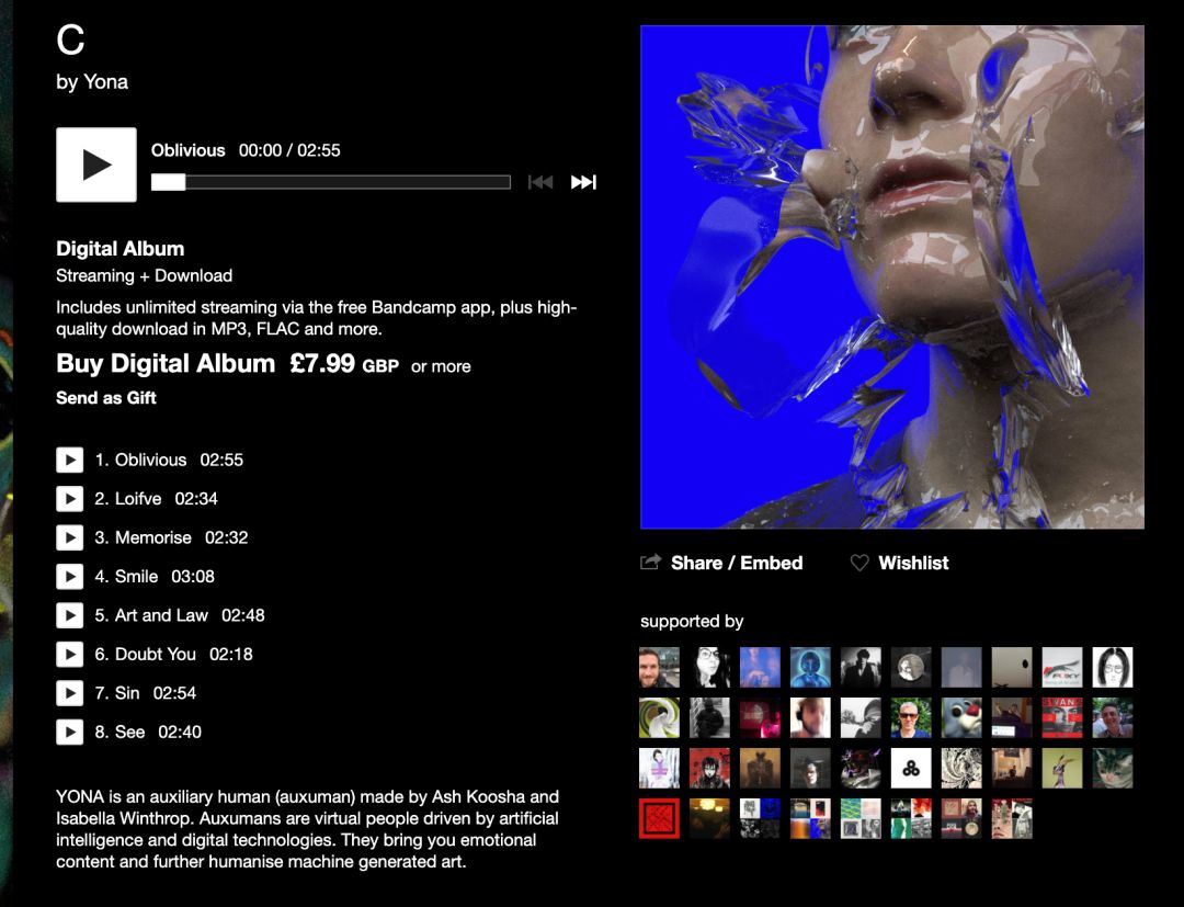 开发者名字叫Ash Koosha,是一位伊朗裔的音乐制作人。他创办了一家叫Auxuman的人工智能概念公司,不久前,Auxuman发行了一张音乐合辑,《Auxuman Vol.1》,收录了5位AI歌手演唱的歌曲,其中包括YONA。