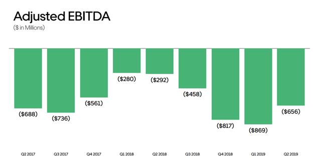 然而,CEO关于规模带来盈利的理论有待检验,实际上规模扩展的同时,公司亏损持续扩大。根据最新财报,二季度公司亏损超过52亿美元,按每个月30天计算,平均每天亏损4亿元。虽然其中包括39亿美元的一次性上市相关费用的支出,但剩余的13亿美元亏损仍比去年高出50%。如下图,调整后EBITDA在上季度Q1达到-8.69亿美元的新低,从17年末到18年初的亏损缩减趋势并没有延续,亏损在19年Q1到达最高,二季度亏损有所减少,但也处于近年来的亏损高位。