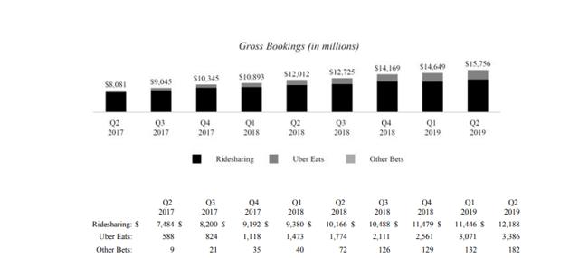 公司CEO在8月的一次采访中表示,公司获得盈利将依赖于规模的持续扩大:“只要你的业务在运输、食品和全球商业方面拥有数万亿美元的市场规模,对一家公司来说,投资都是有意义的。”实际上,公司规模近年来有不小的增长。随着打车订单数的提升,从17年Q2到19年Q2,平台活跃用户数从5700万增长9900万,增速达73%,期间出行量(Trips)从8.89亿增至16.77亿,增速为99%,调整净营收从16.3亿美元增至28.73亿美元,增幅76%。