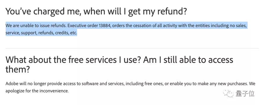 其理由也是美国政府颁布的13884号行政命令,Adobe必须停止所有活动,包括销售、服务、支持、退款等等。
