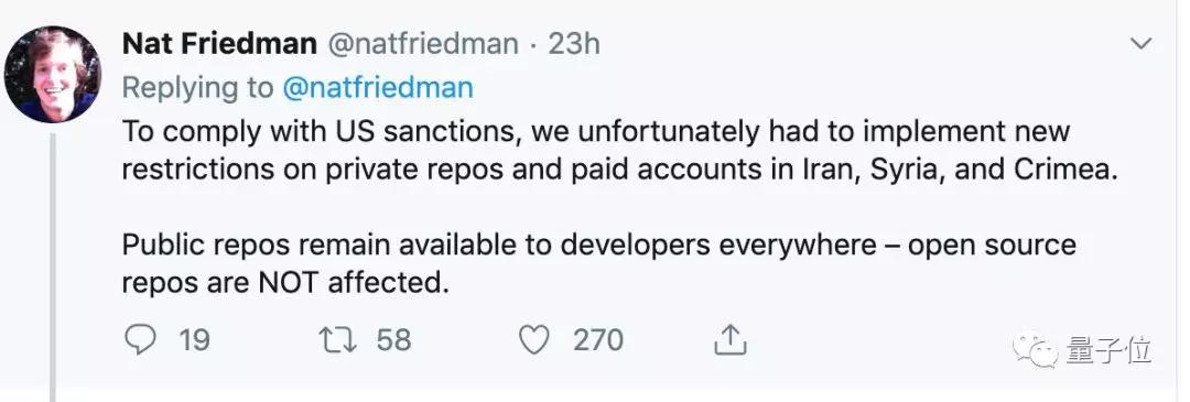 7月份,GitHub突然断供伊朗等地区之后,其CEO Nat Friedman也在社交媒体上给出了回应,毕竟GitHub是一家注册在美国、在美国开展业务的公司:
