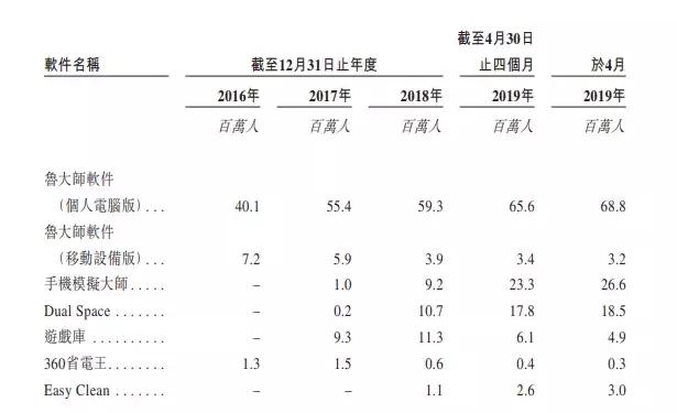 即使现在,鲁大师的表面数据还是说得过去的。根据第三方弗若斯特沙利文统计,截至2018年12月31日止年度,就用户基础而言,基于个人电脑及移动设备每月活跃用户市场份额分别为98.8%、58.9%。截止2018年12月,该公司产品的每月活跃用户约为113.6百万人。