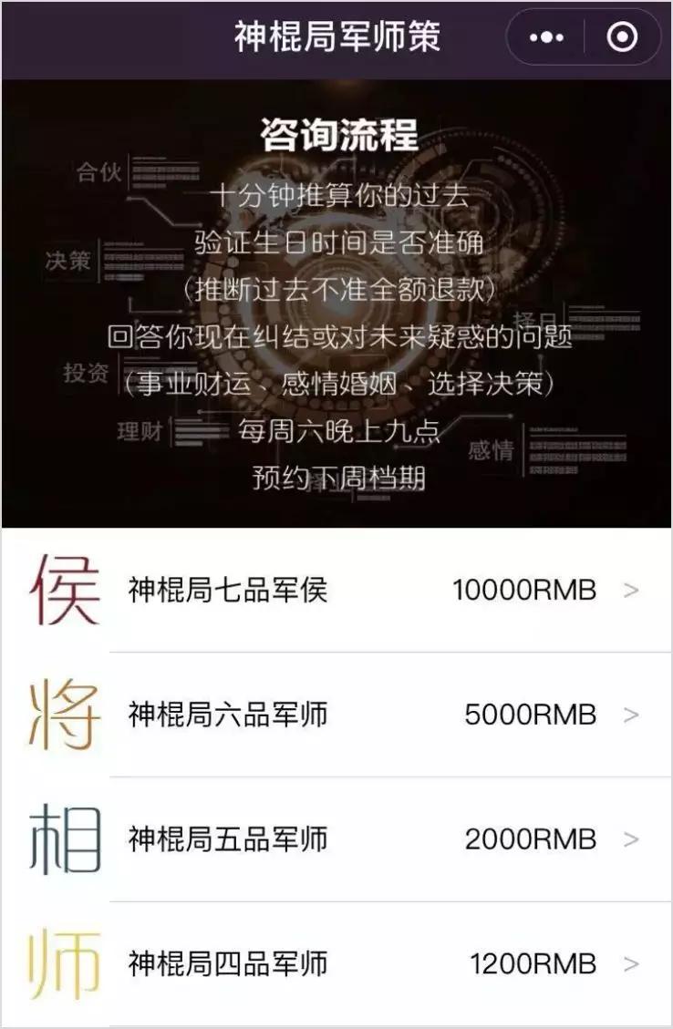 几个月后,神棍局推出“神棍局军师策”服务(在线一对一算命),最高一次 10 分钟销售收入 60 万。