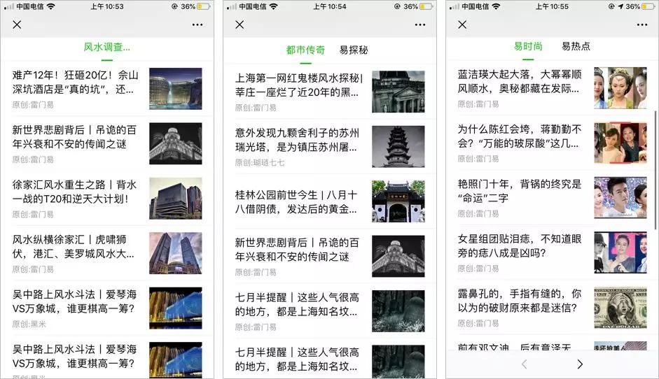 这个号主要推送风水、都市传奇、探秘和明星相关的文章,主要理论依据也是易经。这些文章巧妙抓住了人们的好奇和窥探心理,尤其是风水探秘类文章,读起来很有看鬼故事的刺激感,而一些文章和明星挂钩,则可以吸附更多流量。