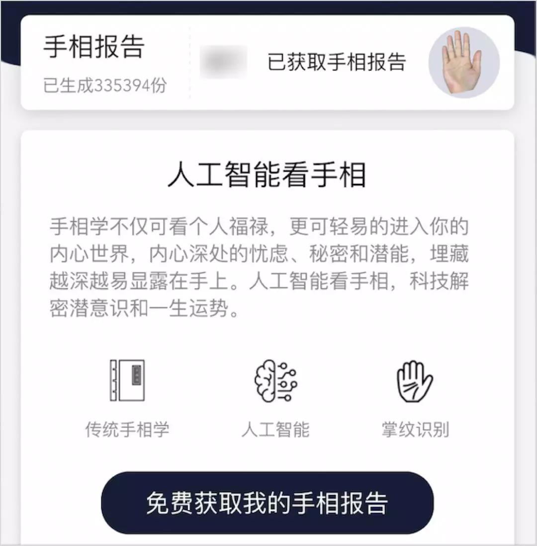 当然“大师们”是不会停止赚钱的脚步的,在 AI 面相之后又推出了 AI 看手相,借助“手相学”和科技解密潜意识和一生运势。