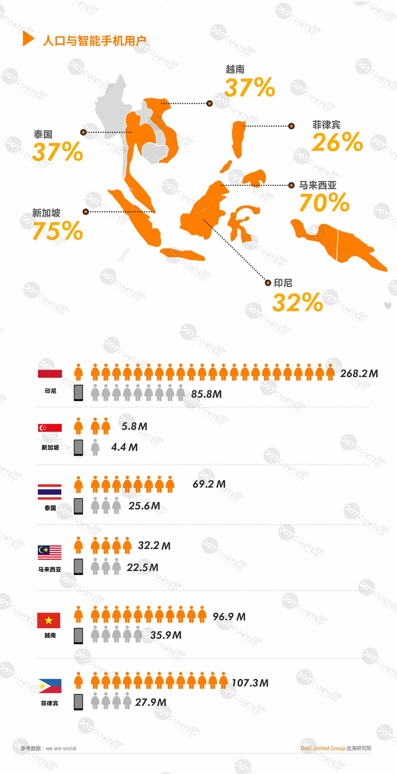 东南亚总人口超过6.5亿,包括11个国家,各国之间经济状况、语言、文化风俗、宗教信仰、互联网基础建设等不尽相同,从移动互联网发展的成熟度以及规模来看,印尼、泰国、新加坡、越南、马来西亚、以及菲律宾为东南亚六大市场。